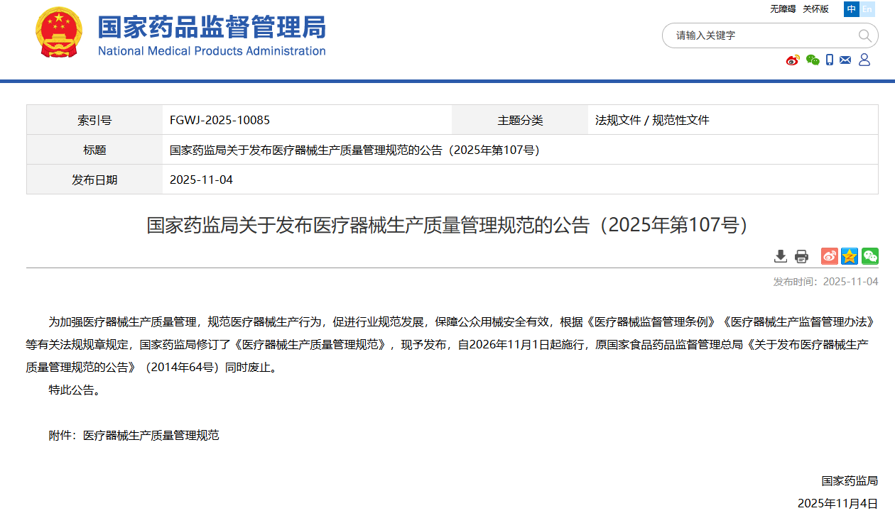 2025年11月4日国家药监局发布新版《医疗器械生产质量管理规范》。